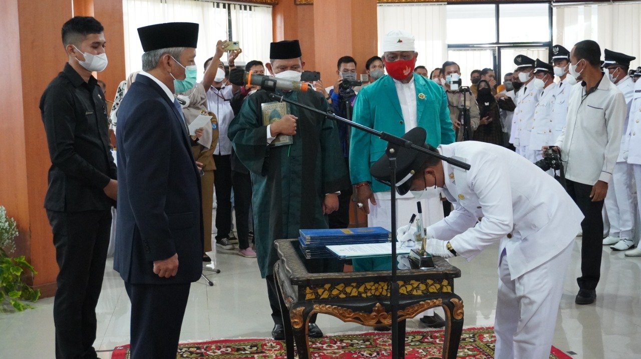 Pingintau.id, Bupati Ogan Komering Ilir (OKI), H. Iskandar, SE melantik sebanyak 145 orang Kepala Desa Terpilih hasil pemilihan kepala desa serentak tahun 2021 di Kayuagung, Selasa, (21/12). Kepada para kepala desa yang dilantik Bupati Iskandar menyampaikan tugas pertama kepala desa terpilih, yaitu menyatukan dan membahagiakan warga.