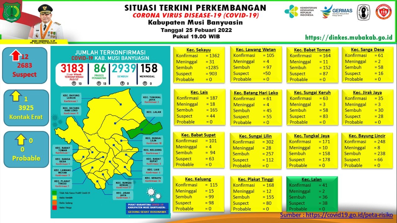 Berdasarkan data update Gugus Tugas Penanganan COVID-19 Muba 25 Februari 2022 tercatat ada sebanyak 429 ODP 429 selesai pemantauan 0 masih dipantau, 1.199 kontak erat 1.199 kontak selesai pemantauan 0 kontak erat yang masih dipantau, 191 PDP 0 proses pengawasan 191 selesai pengawasan.[***]