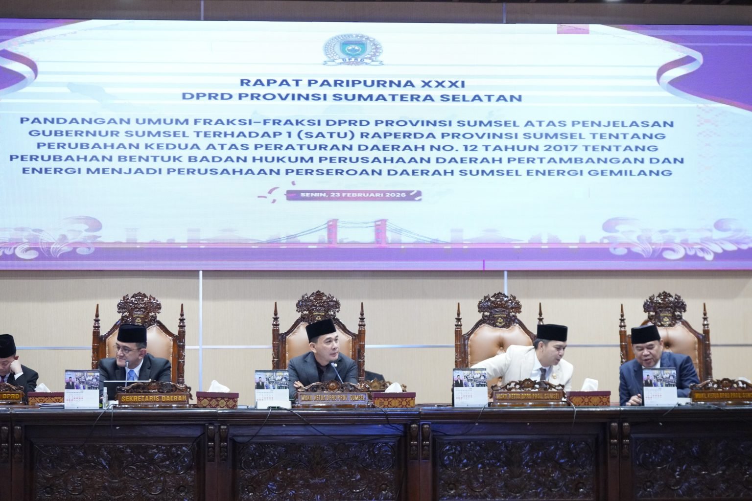Pingintau.id – Dewan Perwakilan Rakyat Daerah (DPRD) Provinsi Sumatera Selatan menggelar Rapat Paripurna dengan agenda penyampaian Pandangan Umum Fraksi-Fraksi terhadap penjelasan Gubernur Sumatera Selatan mengenai Rancangan Peraturan Daerah (Raperda) tentang Perubahan Kedua atas Peraturan Daerah Nomor 12 Tahun 2017 terkait perubahan bentuk badan hukum perusahaan daerah pertambangan dan energi menjadi Perseroan Daerah PT Sumsel Energi Gemilang. Rapat berlangsung pada Senin (23/1/2026).
