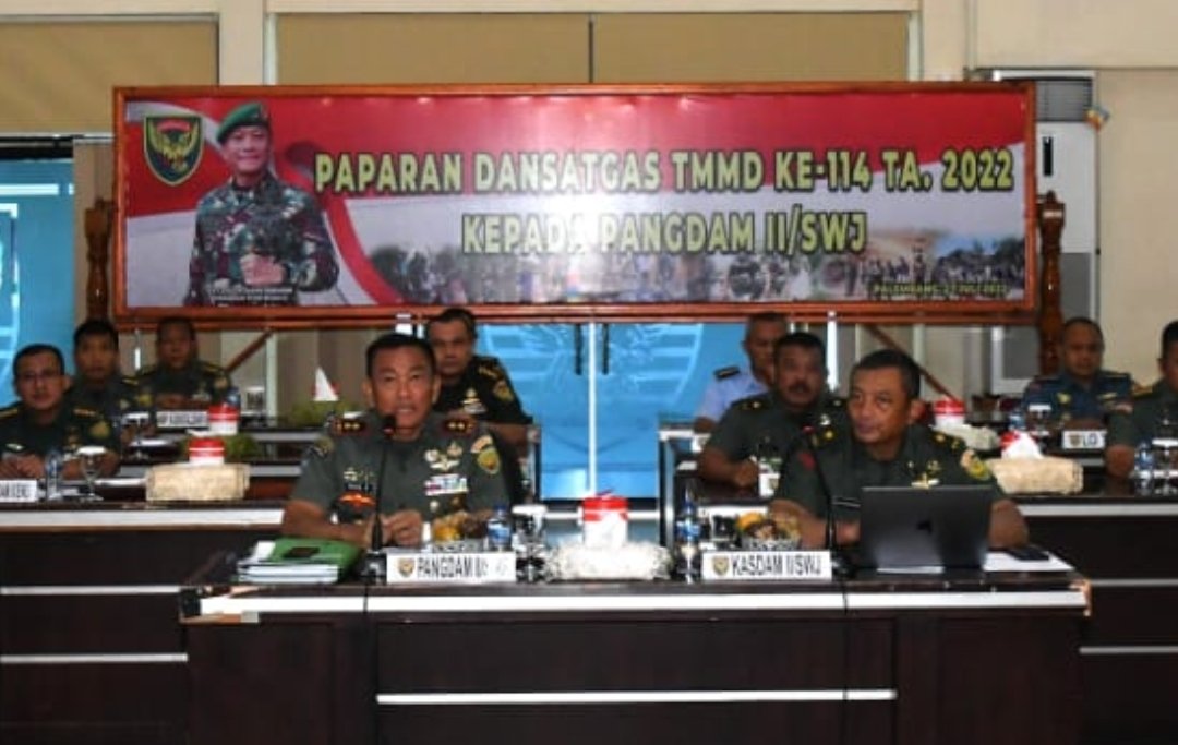 Untuk meyakinkan pelaksanaan TMMD Ke-114 TA 2022 di wilayah Kodam II/Swj dapat berjalan sesuai rencana yang sudah diprogramkan, dalam rapat tersebut Pangdam II/Swj Mayjen TNI Agus Suhardi, menerima paparan dari para Dandim jajaran yang menjabat sebagai Dansatgas TMMD.