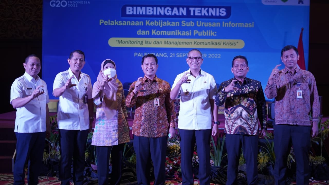 Gubernur Sumatera Selatan H Herman Deru diwakili Kepala Dinas Kominfo Prov Sumsel H Achmad Rizwan SSTP, MM menghadiri dan memberikan kata sambutan pada acara Bimbingan Teknis Pelaksanaan Kebijakan Sub Urusan Informasi dan Komunikasi Publik “Monitoring Isu dan Manajemen Komunikasi Krisis” yang diselenggarakan oleh Direktorat Tata Kelola dan Kemitraan Komunikasi Publik Kementerian Kominfo RI bertempat di Aryaduta, Rabu (21/9/2022)