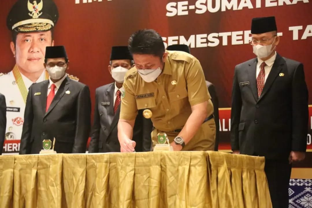 Pungintau.id – Dalam mempercepat akses keuangan bagi masyarakat guna mendukung pulihnya perekonomian di daerah. Gubernur Sumsel H Herman Deru mengukuhkan 10 Sekda Kabupaten/Kota sebagai Kordinator Tim Percepatan Akses Keuangan Daerah (TPAKD) semester I tahun 2022 yang dipusatkan di Ballroom Hotel Novotel Palembang, kemaren.