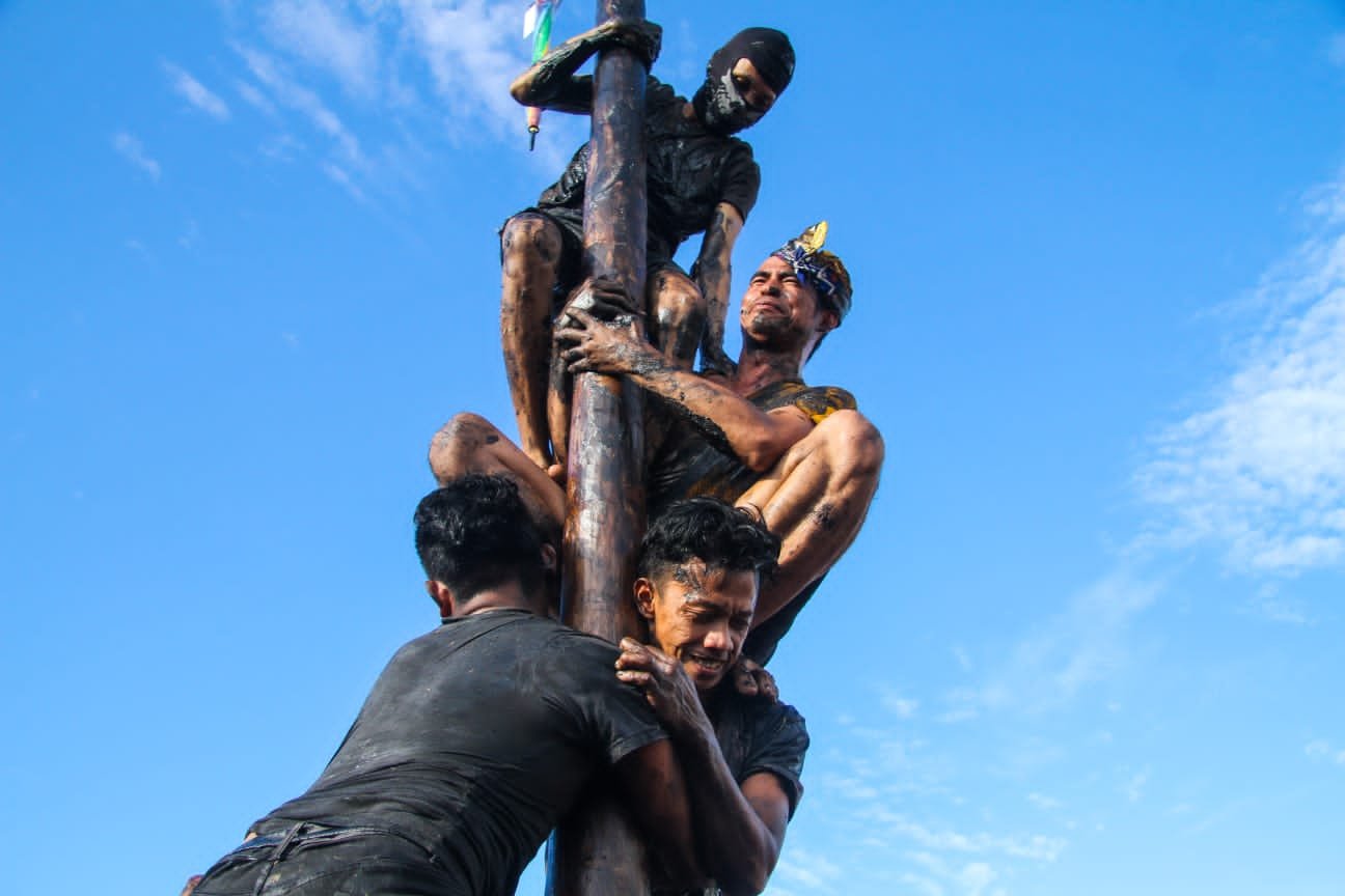 Suasana di lokasi tampak sorak sorai dan gelak tawa ratusan penonton yang sangat antusias menyaksikan lomba panjat pinang memacu semangat para peserta untuk segera mencapai puncak batang pinang dan menurunkan berbagai hadiah yang telah disediakan panitia.