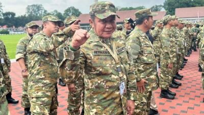 Pingintau.id, – Gubernur Sumatera Selatan Herman Deru dengan mengenakan seragam komponen cadangan (komcad) lengkap tiba…