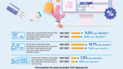 Pingintau.id, Likuiditas perekonomian atau uang beredar dalam arti luas (M2) pada November 2021 tumbuh meningkat….