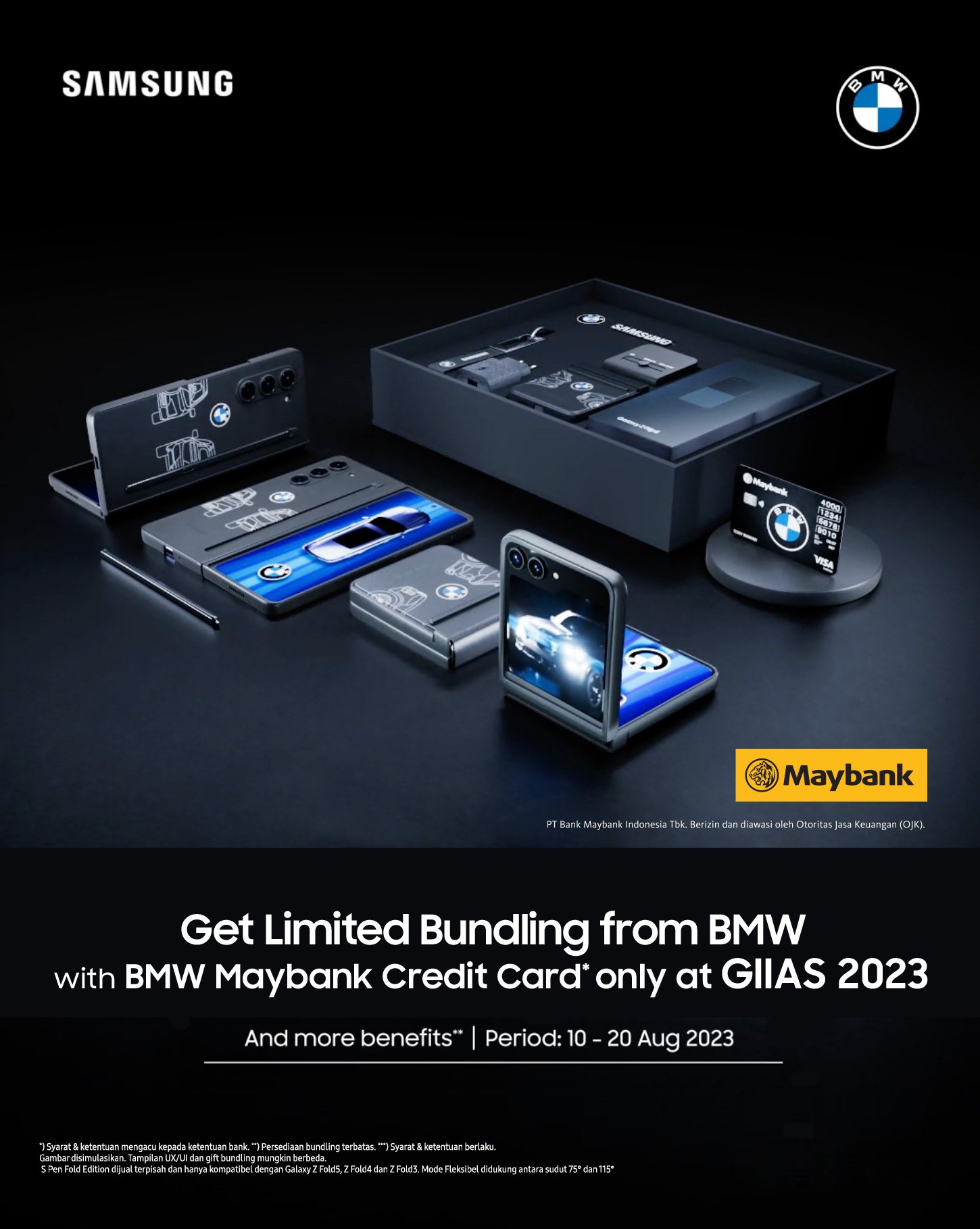 Galaxy Z Fold5 | Z Flip5 BMW Special Edition hanya bisa didapatkan selama event GIIAS 2023 berlangsung. Para pengunjung yang penasaran dengan edisi spesial dari Galaxy Z Fold5 dan Galaxy Z Flip5 dapat langsung mendatangi BMW Group Pavilion di GIIAS 2023 dan melakukan preorder. Syaratnya, kamu hanya perlu melakukan booking kendaraan BMW model apa saja atau menggunakan BMW/MINI Maybank Credit Card saat melakukan transaksi.