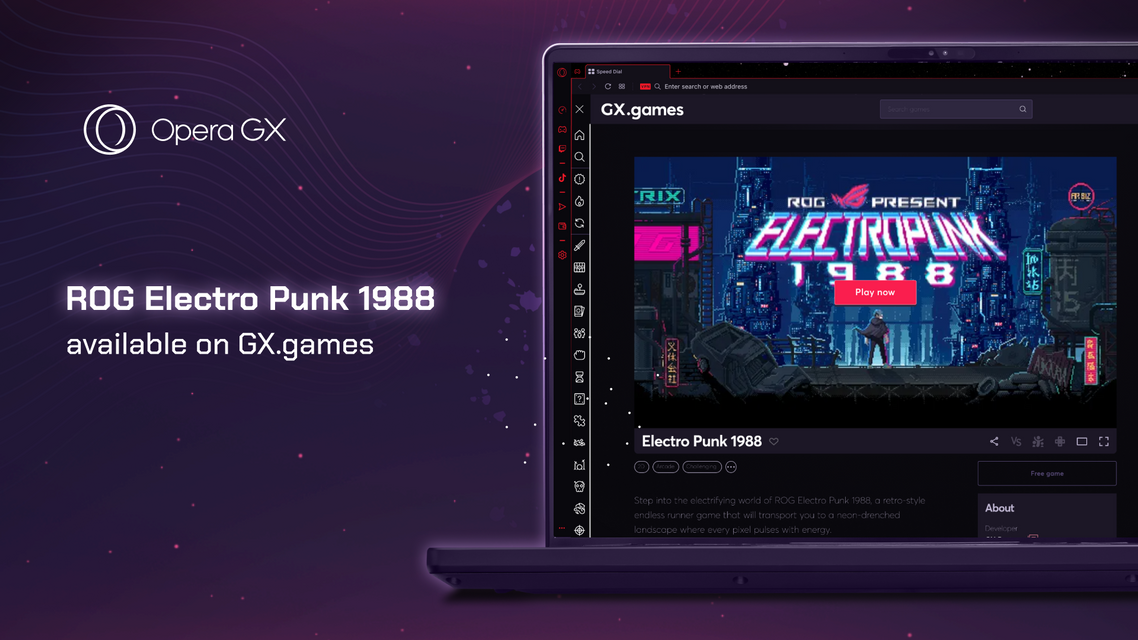 Laptop, desktop, monitor, dan penawaran ROG lainnya memiliki estetika yang kohesif, dan kini pengguna dapat memperluas tampilan tersebut dengan browser Opera GX ROG Edition. Ia menawarkan wallpaper ROG, musik latar belakang dan klip suara serta fitur-fitur seperti game ROG Electro Punk.