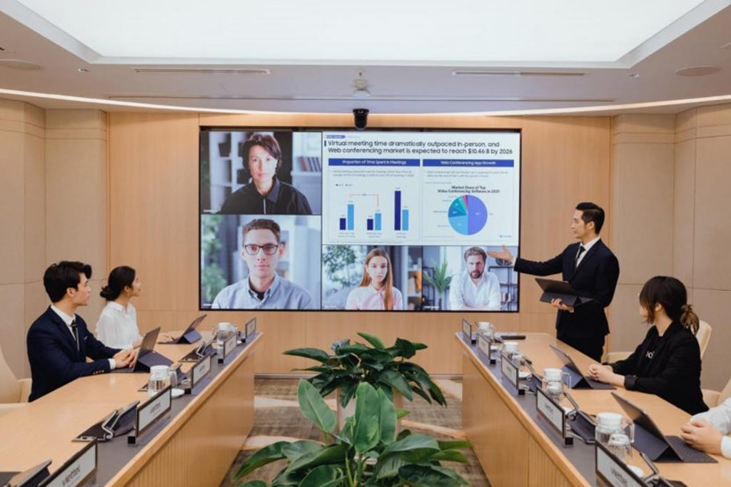 Audio-Technica memperlihatkan contoh bagaimana pengalaman rapat yang imersif di ruang kantor dapat diwujudkan dengan solusi visual Samsung dengan ukuran layar dari 40 hingga 49 inci, sementara dipasangkan dengan solusi konferensi video perusahaan audio visual Jepang tersebut.