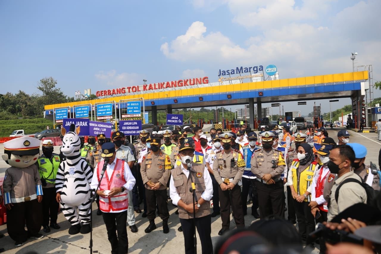 Pemberlakuan sistem one way ini ditinjau oleh Menteri Pembangunan Manusia dan Kebudayaan (Menko PMK) Muhadjir Effendy, bersama Menteri Perhubungan, Budi Karya Sumadi, Menteri PUPR, Basuki Hadi Muljono dan Kakorlantas Polri, Firman Santyabudi, di GT Kalikangkung, Jumat, (6/5/2022).