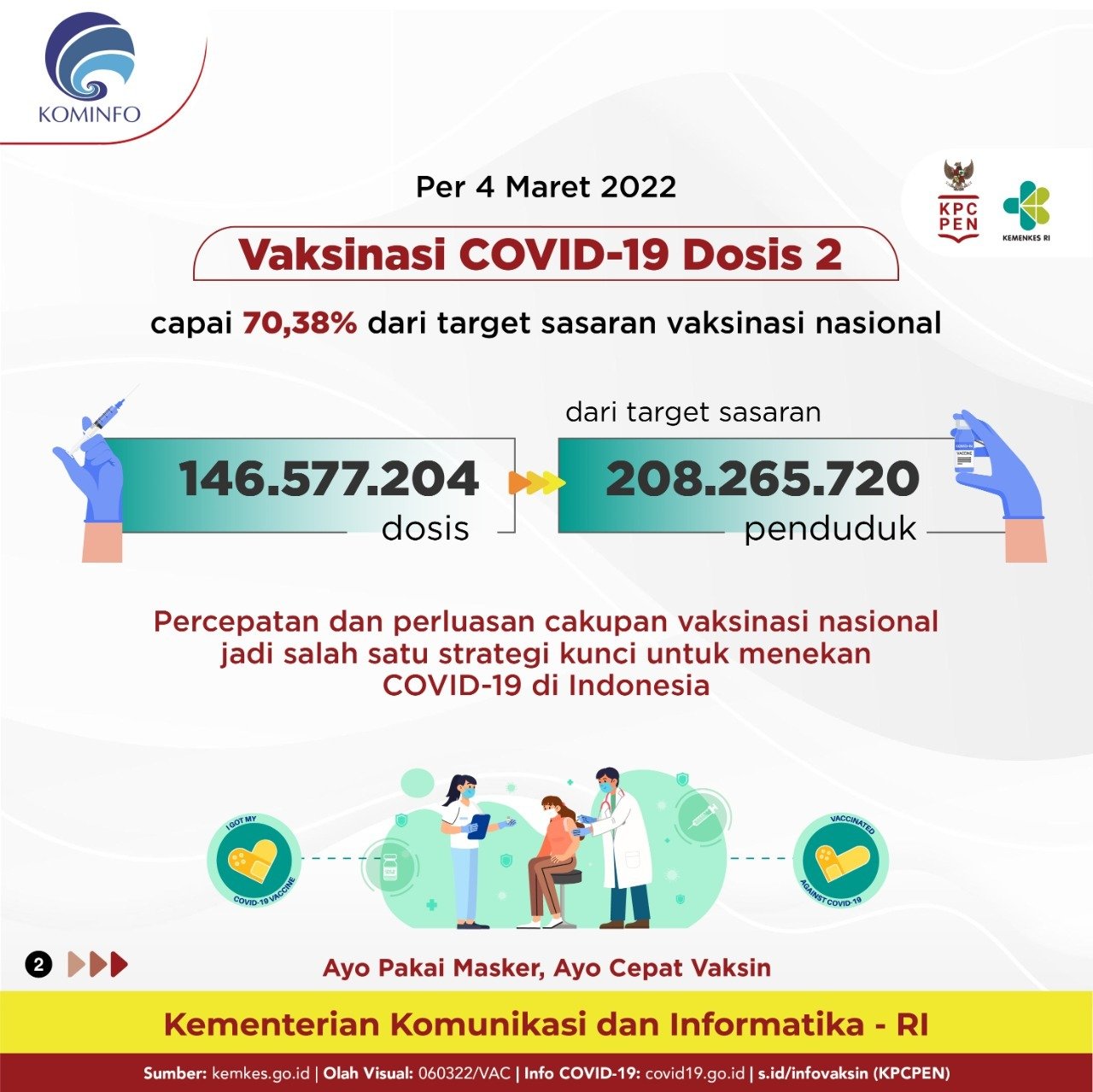 Pingintau.id, PER 4 Maret 2022 vaksinasi COVID-19 untuk dosis 2 sudah mencapai 70,38% atau 146.577.204 dosis dari target sasaran vaksinasi nasional sebesar 208.265.720 penduduk.
